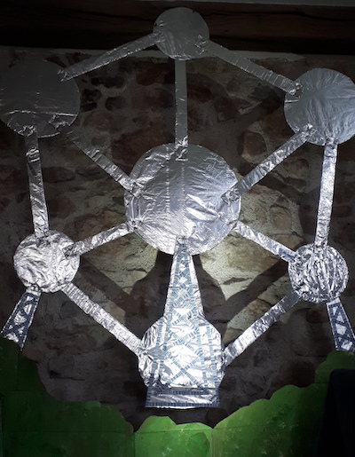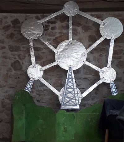 Cinquième week-end, nous aurions dû aller en Belgique pour voir ma famille, chose bien sur rendue impossible par le covid. J’ai donc créé un Atomium (l’équivalent belge de la tour Eiffel) sur mesure pour le salon, entièrement réalisé en carton et recouvert de feuilles d’aluminium.