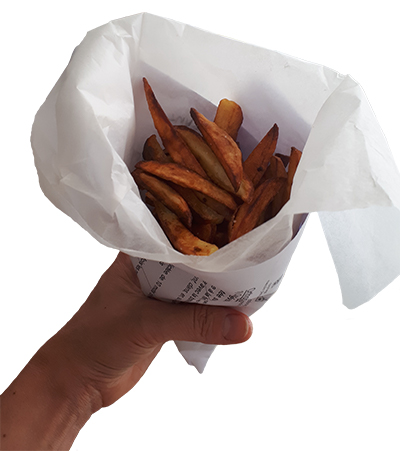 J’ai aussi peint du carton en vert pour la végétation (N.B.: toujours avoir un peu de peinture acrylique chez soi, ça peut servir!). J’ai tout assemblé avec une agrafeuse basique et fait des frites maison à déguster dans un cornet en papier.