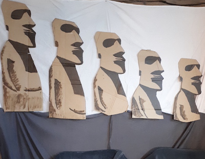 Puis il a suffi d’accrocher un drap blanc pour masquer le mur et d’y accrocher nos « statues de Pâques », résultat garanti!