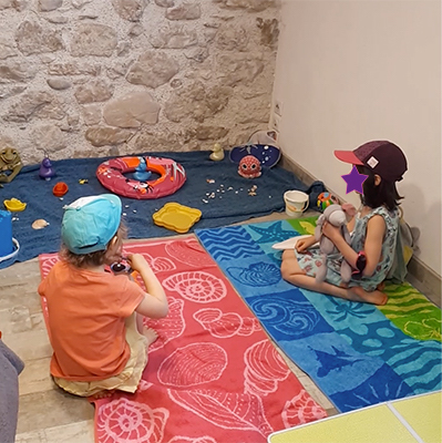 J’ai repoussé les canapés, installé un tissu bleu le long du mur pour la mer, j’y ai installé des canards, des poissons et des coquillages.
