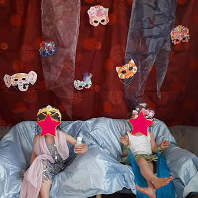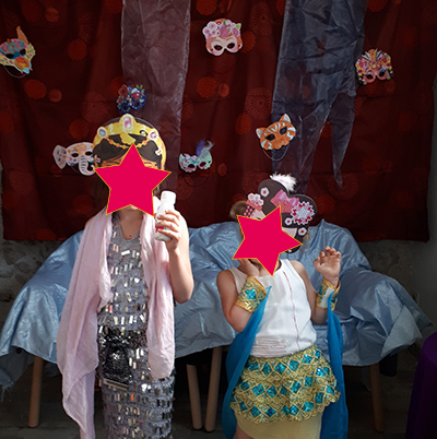 En guise de décor, j’ai accroché aux murs de vieux rideaux et tissus colorés et j’y ai épinglé tous les masques de carnaval que j’ai pu trouver dans la maison (nous en avions fait un certain nombre ces dernières années, les filles aimant tout autant les loisirs créatifs que moi…).