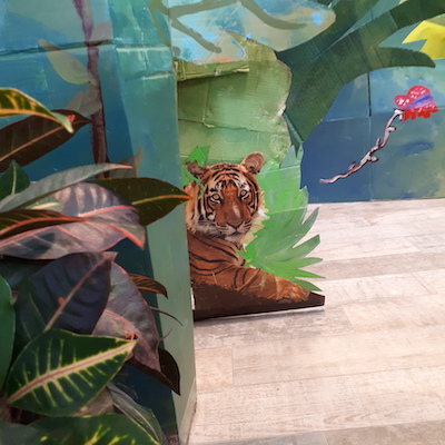 J’ai utilisé des draps vert et marron, des bouts de tissu, des cordes pour créer des lianes. J’ai aussi découpé des photos d’animaux dans des magazines animaliers des filles pour plus de réalisme et je les ai collés sur des cartons.