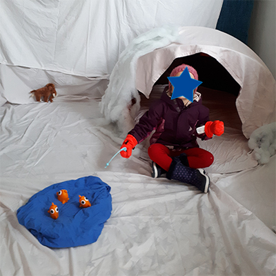 Sixième week-end (déjà!), cette fois, dépaysement garanti, nous changeons d’univers et partons au Pôle Nord! Je réutilise la tente, transformée en igloo pour l’occasion avec de simples draps blancs, que j’utilise d’ailleurs aussi pour recouvrir les murs.