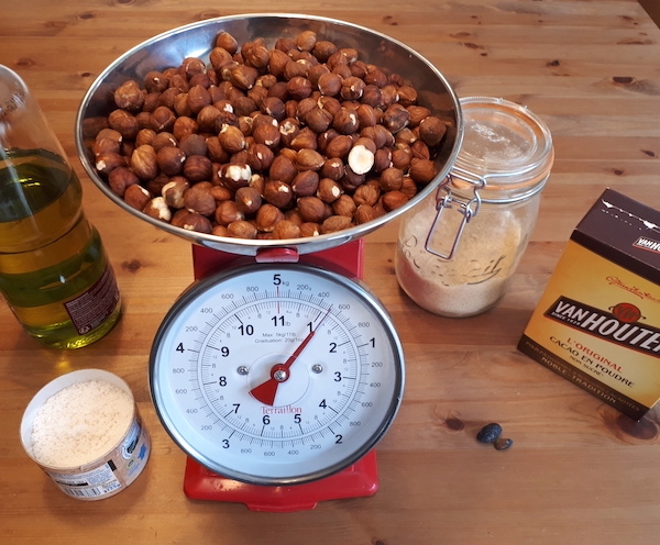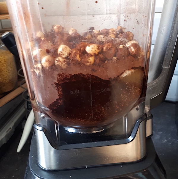 4.Dans le blender verser l’huile, le sucre, le sel, le cacao non sucré et les noisettes encore chaudes.