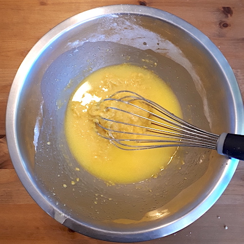 5.Battre les jaunes avec le sucre et le sel, ajouter le beurre fondu, la farine, et les noix réduites en poudre.