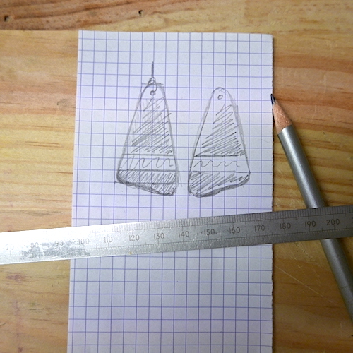 Avant, pendant ou après avoir choisi mon matériel (ça n’a pas une grande importance), je dessine un croquis rapide pour voir concrètement à quoi le bijou final ressemblera. Quelle sera sa forme, sa taille, y a-t-il plusieurs éléments à assembler? Bref, je précise mon idée de départ.