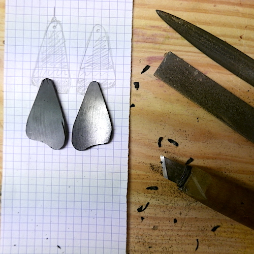 Une fois que j’ai fait mon croquis, choisi mon matériel, et sorti mes outils, je fabrique le bijou (je ne rentrerai pas ici dans les détails, mon but n’étant pas ici de donner un cours sur le travail du bois ou le bon usage des outils…).
