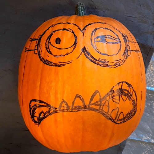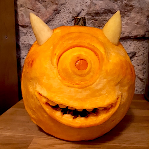 J’ai donc investi (pour une somme modique) dans un petit kit d’outils trouvé sur internet. Pour Halloween 2020, j’ai donc sculpté deux citrouilles. Pour la première, j’ai représenté Mike Wazowski, un petit monstre sympathique qu’on retrouve dans le dessin animé « Monstres et compagnie ».
