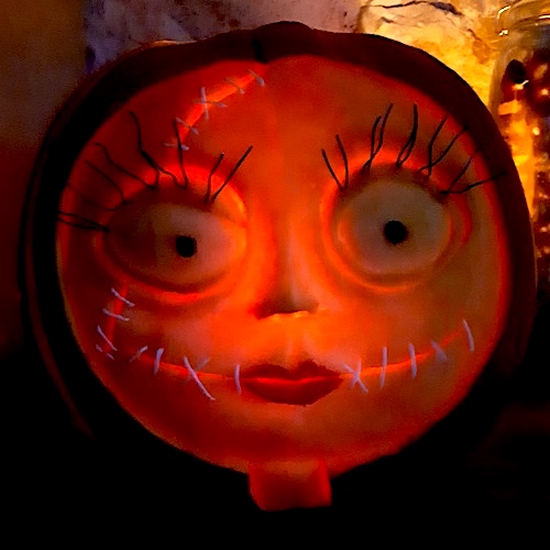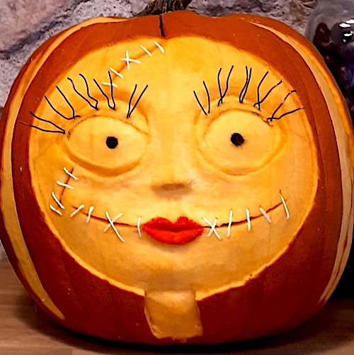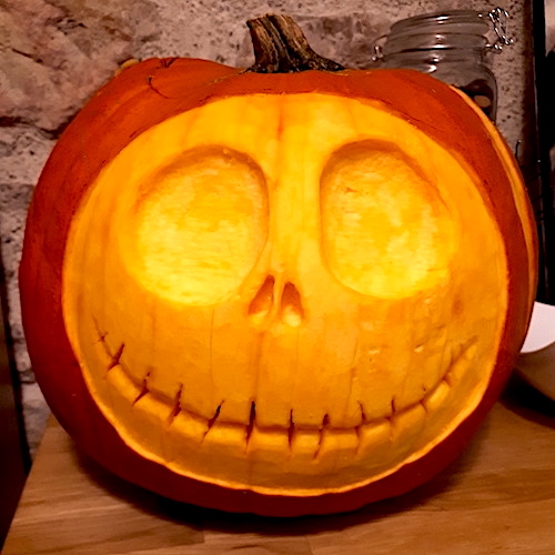 Pour ma deuxième citrouille, qui était de belle taille, j’ai sculpté, d’un côté, le visage de Jack Skellington (le personnage principal du film d’animation « L’étrange Noël de Mr Jack ») et, de l’autre le personnage de Sally (du même film).