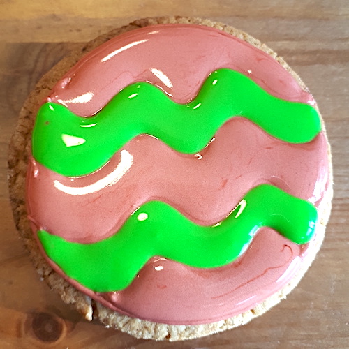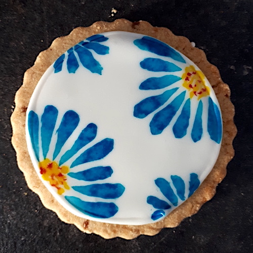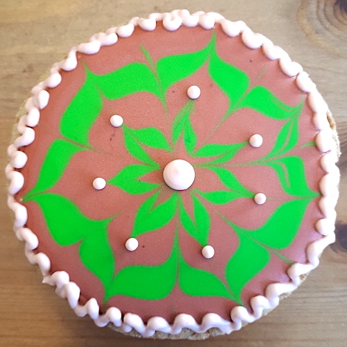 2.Technique du « wet on wet » (« mouillé sur mouillé » en français): pendant que la couche de couverture du biscuit est encore humide, on utilise une ou plusieurs autres couleurs (et une consistance fluide) pour créer des motifs directement « dans » la couche déjà en place.