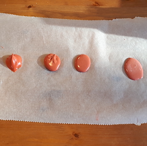 Lorsque j’ai besoin de faire plusieurs textures avec la même couleur, je commence par la plus ferme, dont je prélève une partie lorsque je l’ai obtenue, puis je continue l’ajout d’eau pour une texture plus fluide etc.