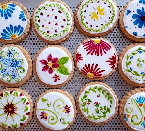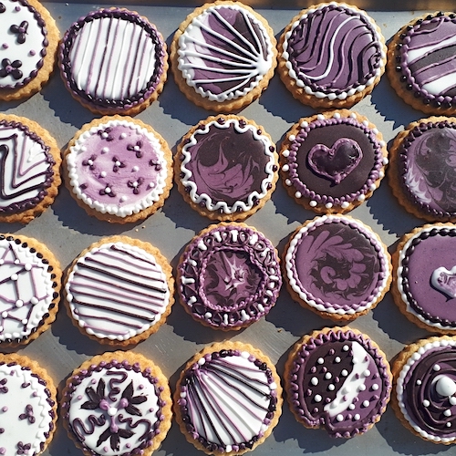 On peut aussi alterner les couleurs au moment de couvrir le biscuit (toujours avec des textures de glace royale fluide) et les mélanger avec la pointe pour créer des motifs.