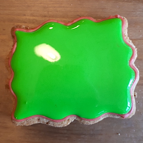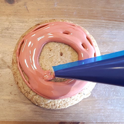 Faire le contour du biscuit en gardant un peu de distance par rapport au bord pour éviter les coulures éventuelles (comme la texture est plus liquide elle peut couler légèrement) et sans appuyer trop fort sur la poche, puis remplir directement l’intérieur du contour avec la même glace royale. Une fois le biscuit couvert on utilise la petite pointe métallique (ou le cure-dent) pour rapprocher la glace du bord de façon homogène et esthétique.