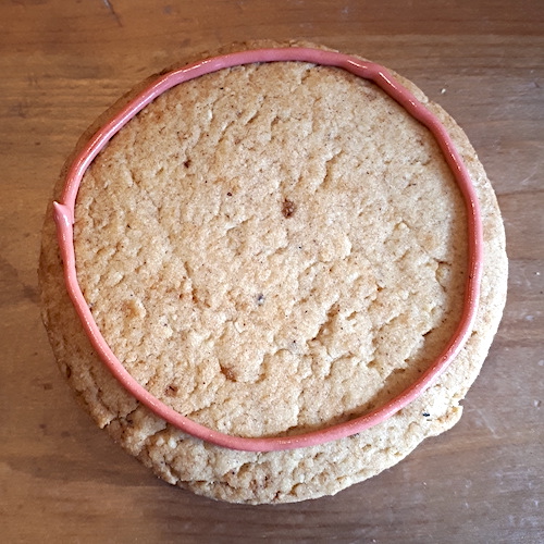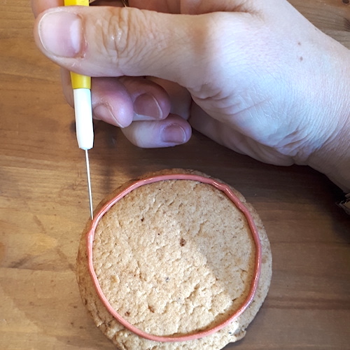 Faire le contour du biscuit délicatement avec la texture ferme, en restant assez près du bord (la glace royale ne coulera pas). L’embout de la douille ne touche le biscuit qu’au début et à la fin du contour, le reste du temps il est légèrement en hauteur. Vous pouvez soutenir légèrement la main qui tient la poche à douille avec l’autre main pour une meilleur stabilité.