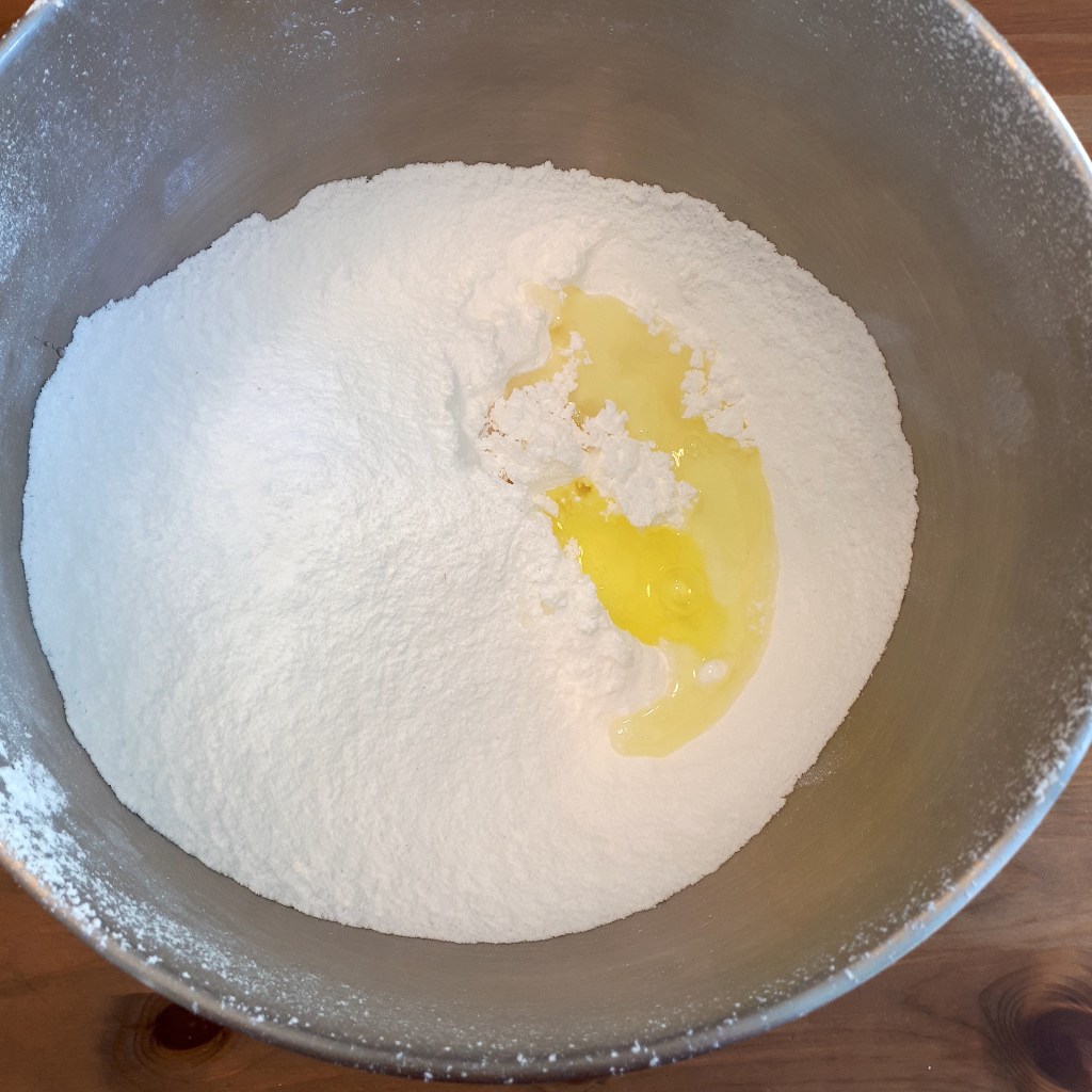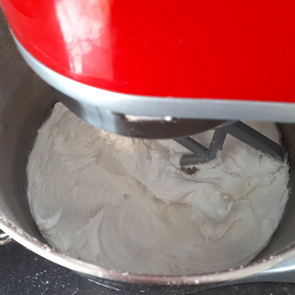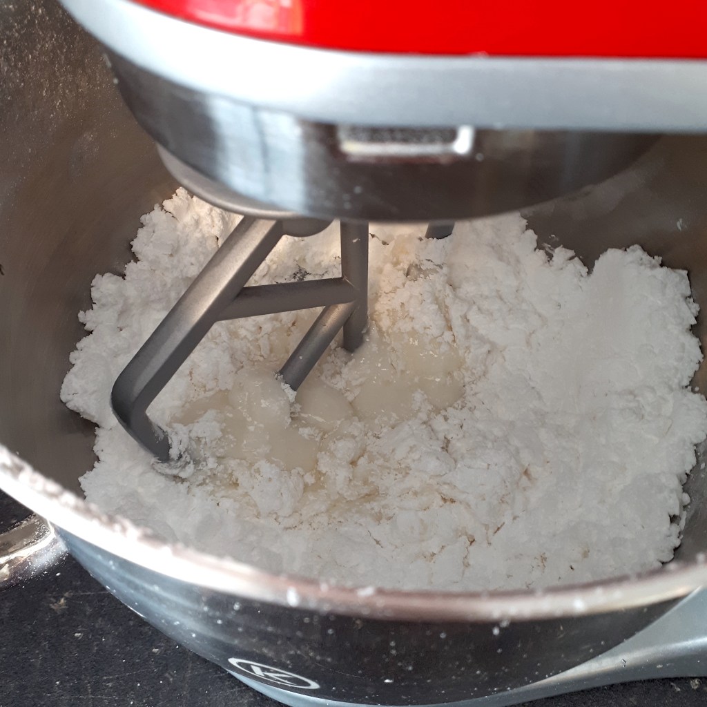 2.Mélanger les trois ingrédients au robot à l’aide de la feuille (plus adaptée à la consistance ferme que vous obtiendrez) pendant 5 à 10 minutes. Cela permet d’obtenir une pâte qui soit bien blanche.