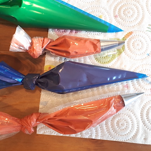 Pensez que, pour chaque couleur et chaque consistance il vous faudra préparer une petite quantité de glace royale individuelle, donc évitez de choisir plus de trois ou quatre couleurs à la fois (c’est déjà beaucoup) et n’hésitez pas à utiliser le blanc comme couleur puisque vous l’avez déjà dans votre glace royale de base.