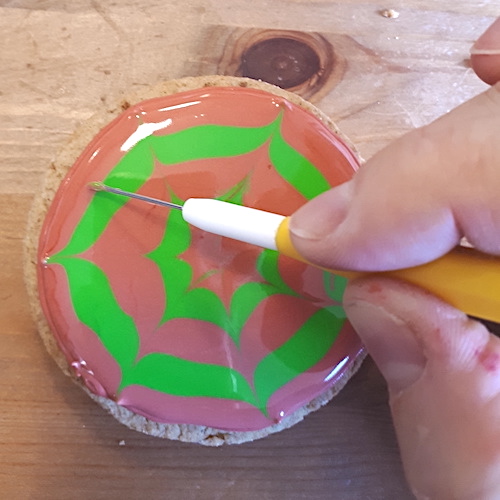 On peut ensuite utiliser la pointe métallique pour travailler les motifs (transformer des points en coeurs, ou en roses, etc.).