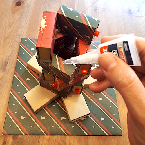15.Commencez à assembler votre calendrier avec la colle pour bricolage. Vous pouvez aussi le faire avec de la super glu si vous préférez. J’ai choisi de coller mes boites sur la tranche pour créer plus de hauteur et qu’il y ait plus de place pour coller les autocollants au moment de la décoration.
