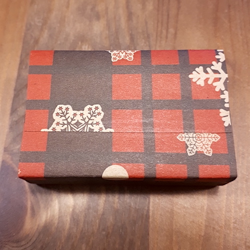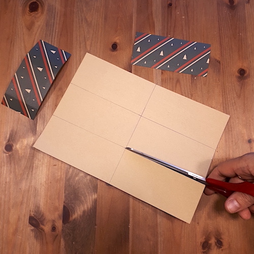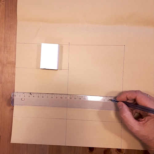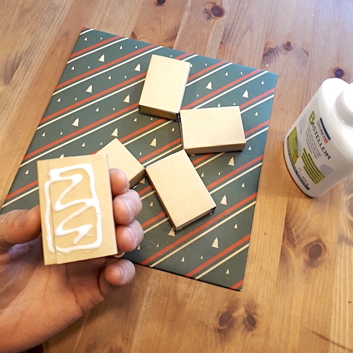 1.En prenant l’une des boites d’allumettes comme gabarit, dessiner des rectangles au verso du papier emballage cadeau. Le rectangle doit être de la même largeur que la boite et être un petit peu plus long que le tour de la boite (pour ne pas avoir d’espace blanc lorsqu’on couvrira la boite).