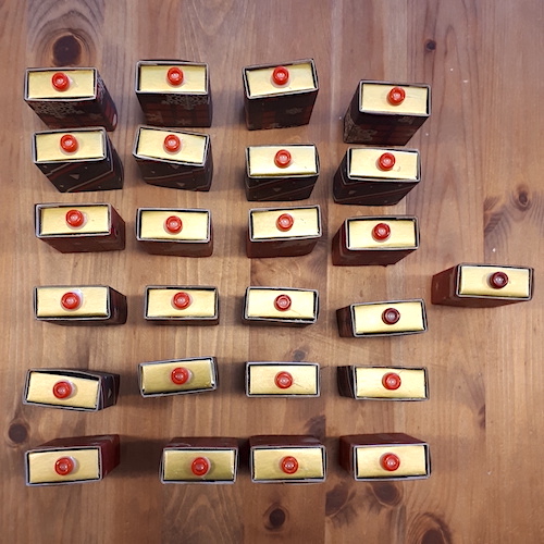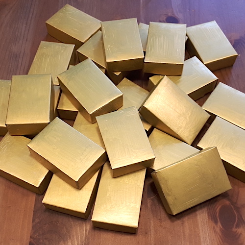 9.Retirer tous les petits « tiroirs » des boites d’allumettes et les peindre en doré. Soit uniquement l’avant et l’arrière, soit, comme je l’ai fait toute la partie blanche du tiroir (l’extérieur).