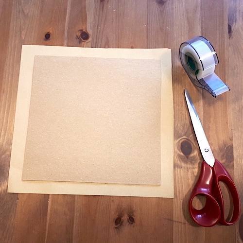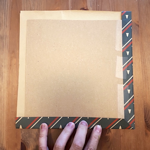 12.Poser le carton sur l’envers de l’emballage et fixer les bords du papier avec du scotch classique après les avoir repliés.