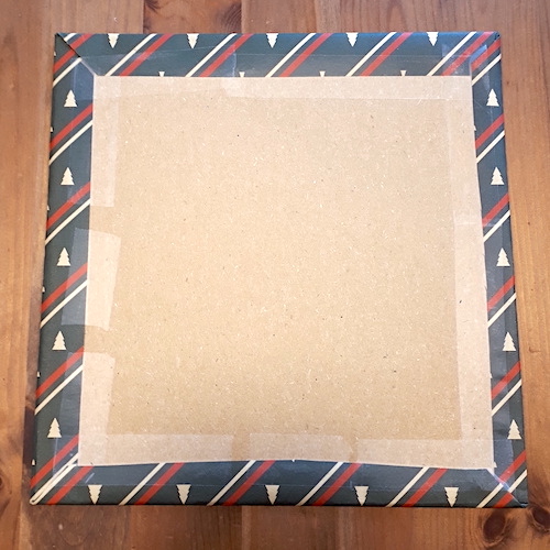 11.Prendre le carton qui servira de base pour le calendrier. Le mien est de forme carrée, mais ce n’est pas obligatoire. L’essentiel est d’avoir un support qui vous permettra de déplacer le calendrier par la suite. Découper un morceau de papier emballage cadeau suffisamment grand pour recouvrir un côté de votre carton et dépasser de 2 cm environ sur tout le pourtour.