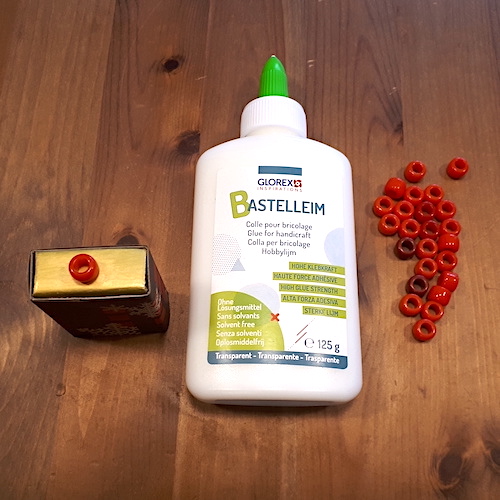 10.Lorsque les tiroirs sont secs, les replacer dans les boites. Déposer un point de colle pour bricolage au centre sur un des côtés du tiroir. Poser une perle dessus. Celle-ci servira de poignée pour ouvrir les tiroirs du calendrier. Répéter l’opération pour tous les tiroirs.