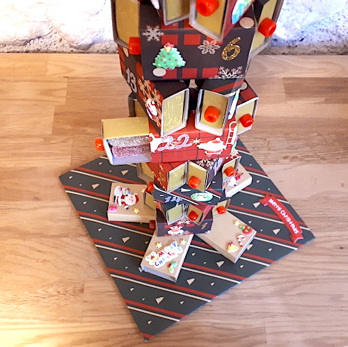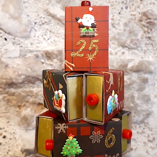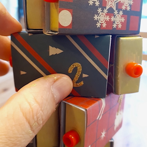 13.S’il vous reste quelques boites d’allumettes en trop, vous pouvez faire comme moi et les utiliser sur la partie inférieure de votre calendrier de l’avent. Cela apportera encore un peu plus de volume. Vous pouvez les décorer également ou les laisser comme elles sont.