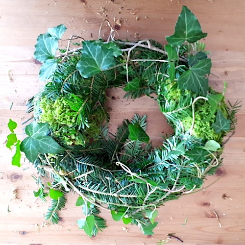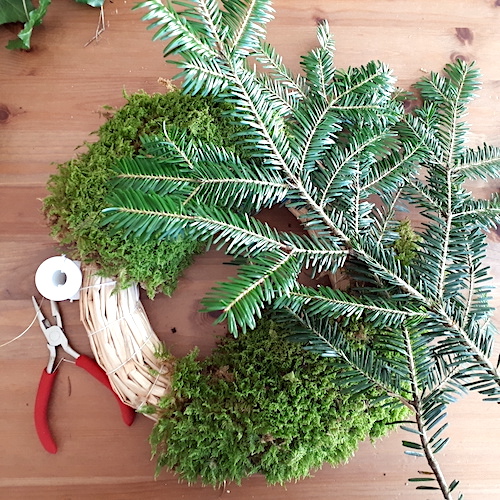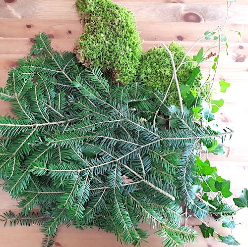 Il n’est pas nécessaire de prendre beaucoup de choses pour recouvrir la couronne. En général, je ramasse ou coupe quelques petites branches de sapin (6 à 8 branches d’environ 30 cm de long suffisent largement) et un peu de lierre.