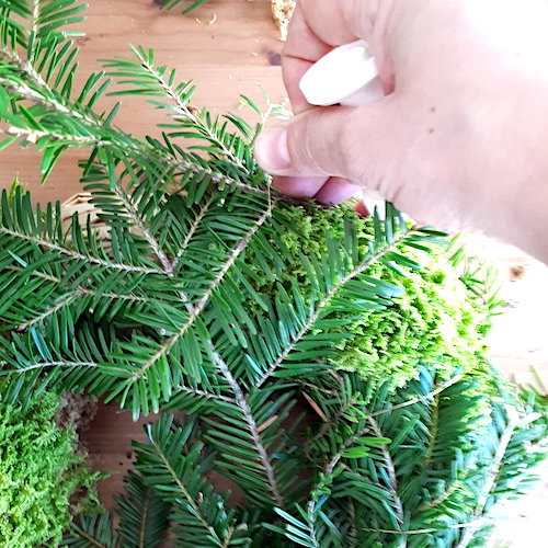 3.Ajouter, si vous le souhaitez, quelques éléments supplémentaires (par exemple du lierre) en les fixant, soit dans les éléments déjà attachés au support, soit avec un peu plus de fil métallique.