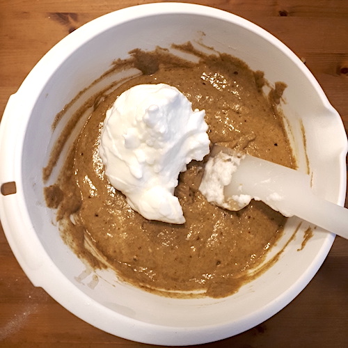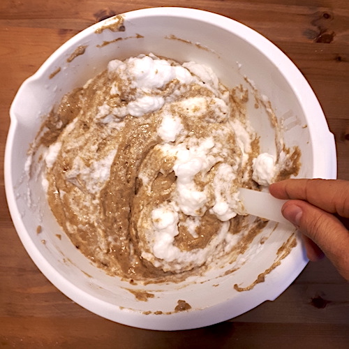 8.Incorporer délicatement les blancs d’oeufs montés en neige à l’aide d’une maryse.
