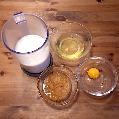4.Mélanger le miel, le jaune d’oeuf et le lait tiède.