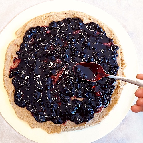 4.Ajouter un peu de purée de myrtilles sur l’ensemble de la crème.