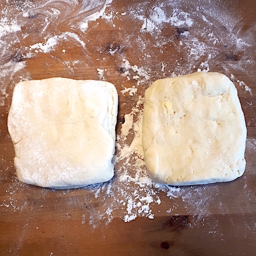2.Diviser la pâte en deux boules et les travailler séparément en suivant les instructions ci-après.