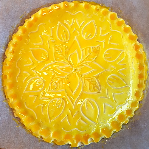 9.Mettre au frais 30 minutes puis à l’aide d’un couteau, dessiner les motifs de votre choix sur la pâte en faisant attention à ne pas la percer. Dorer une seconde fois.