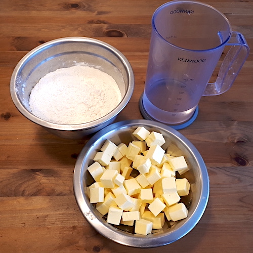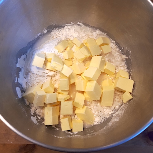 1.Mettre tous les ingrédients dans le bol du robot, puis mélanger une minute. Il reste des petits morceaux de beurre non incorporés, c’est normal, c’est grâce à cela que le feuilletage va pouvoir se faire.