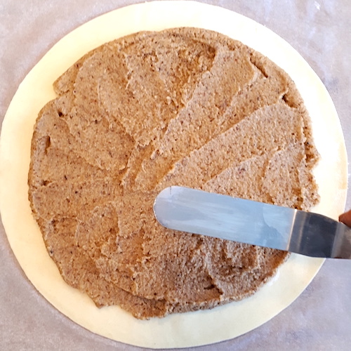 2.Répartir la crème de châtaignes en laissant un bon centimètre sur tout le pourtour de la pâte.