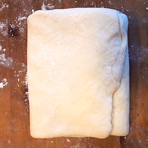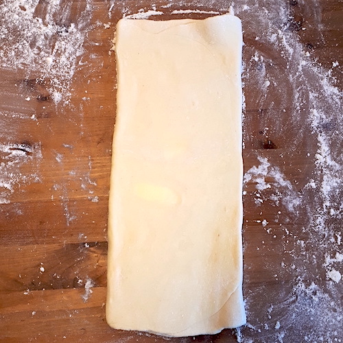 3.Étaler la pâte au rouleau, sur un plan de travail fariné, en un rectangle trois fois plus long que large, puis replier en portefeuille pour donner un premier tour. (Càd. replier le tiers inférieur sur le centre, puis replier le tiers supérieur sur le premier tiers déjà replié).