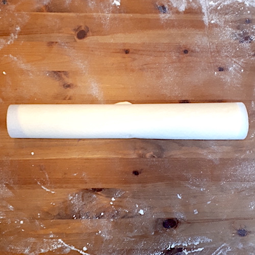NB: Ce n’est pas obligatoire mais je trouve pratique de poser la pâte étalée sur une feuille de papier cuisson avant de la rouler, comme celles que l’on trouve dans le commerce.