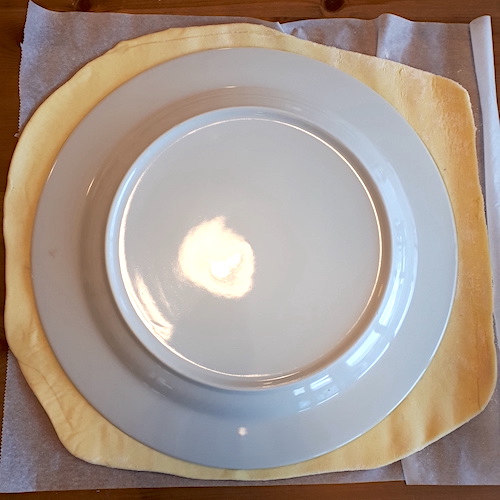 1.Étaler la première pâte sur une feuille de papier cuisson. Taillez un cercle à l’aide d’une assiette ou d’un plat rond.