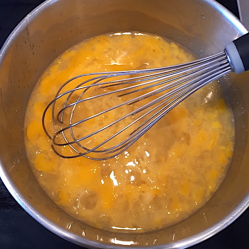 4.Dans une casserole, verser le jus de citron, les zestes, les oeufs et le sucre. Faire cuire à feu doux.