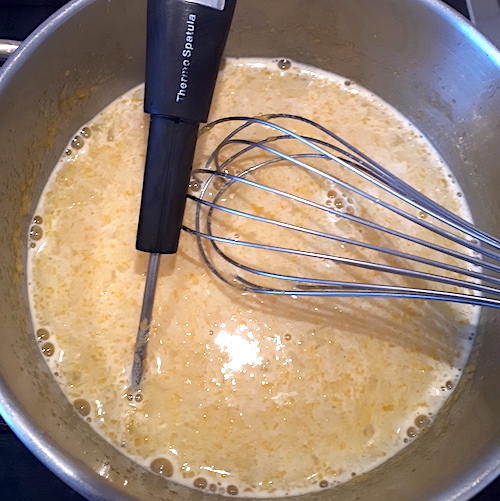 5.Mélanger au fouet pour que la crème n’accroche pas au fond de la casserole.