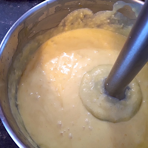 8.Lorsque la température de la crème est redescendue entre 35 et 38°C, ajouter le beurre petit à petit et mixer avec un mixer à pied pour émulsionner la crème.