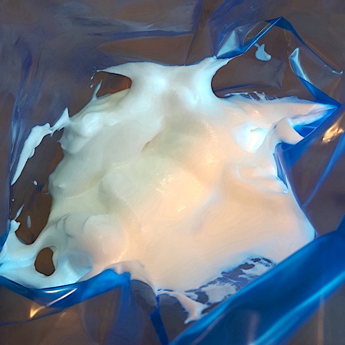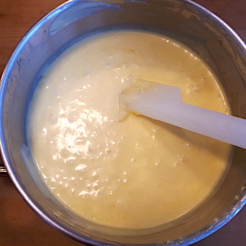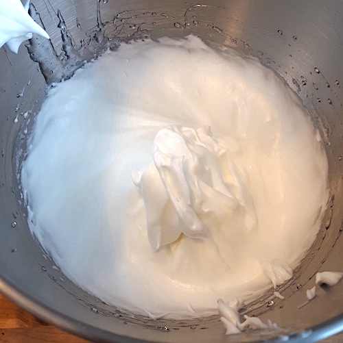 4.Lorsque les blancs d’oeufs sont presque montés et que la température de votre sirop atteint 121°C, verser celui-ci le long du bol tout en continuant à battre les oeufs.
