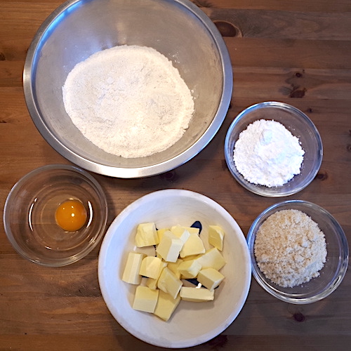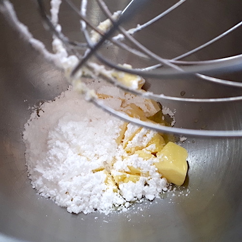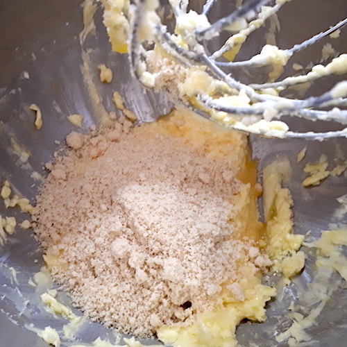 1.Au batteur électrique, mélanger le sucre et le beurre mou, puis ajouter les amandes en poudre, l’oeuf et le sel.