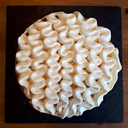 2.Pocher la meringue sur la crème. On peut former des boules, des rosaces, des vagues ou encore, créer un dôme de meringue en lissant la meringue avec une spatule après l’avoir pochée.