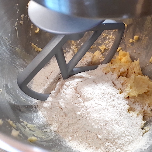 2.Ajouter la farine, remplacer le fouet du robot par la feuille et bien mélanger le tout.
