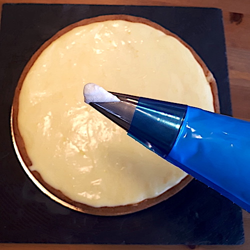 1.Sur la pâte à tarte cuite et refroidie, pocher la crème de citron froide à hauteur du rebord. Lisser la crème.