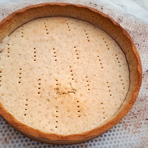 11. Cuire 20-25 minutes. Vous pouvez retirer la feuille de papier cuisson et les billes ou fruits secs en fin de cuisson pour que la pâte soit plus dorée au centre.