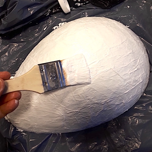 16.Lorsque la colle est sèche, peindre l’extérieur et l’intérieur de l’œuf avec la peinture acrylique blanche. Vous aurez ainsi une sous-couche uniforme qui masquera les textes et images du papier journal.